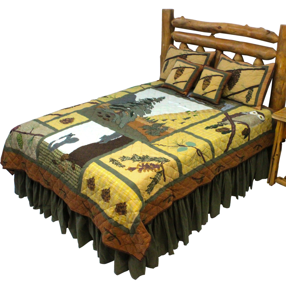 We have gathered the natural beauty of pine out doors with owls, birds, pine trees, and cones in natural earth tones. 100% cotton shell and hand layered organic cotton fill. Hand quilted and hand layered for unique soft touch and warmth.